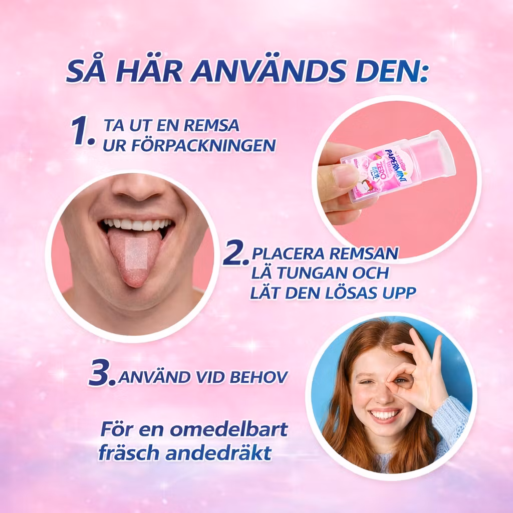 Snabblösliga pappersremsor som placeras på tungan och ger omedelbar fräsch andedräkt.